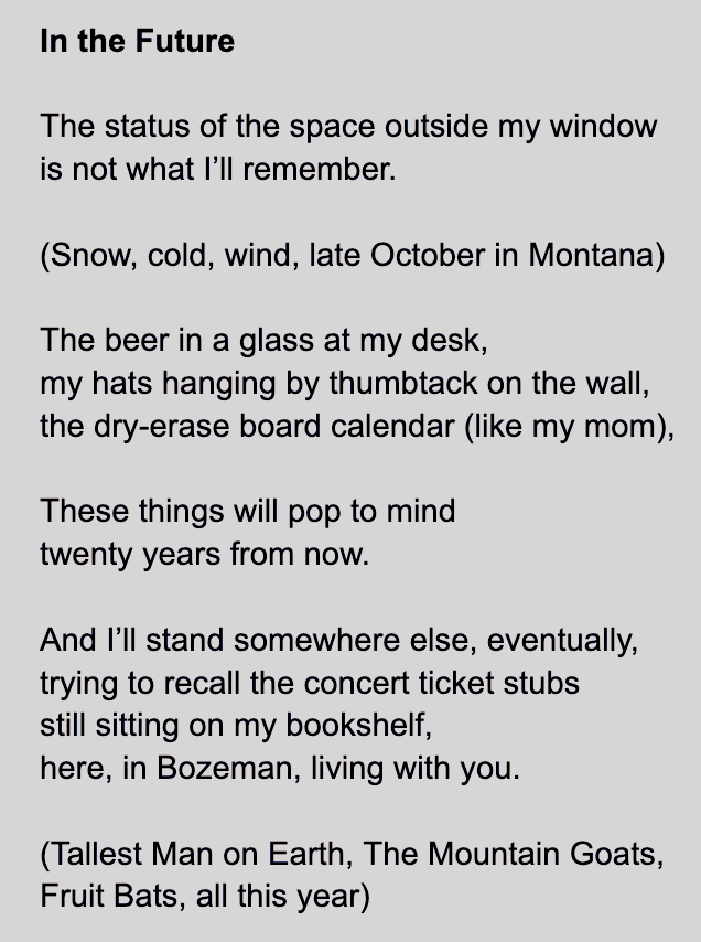 Today, I’m in the future of that poem. Only slightly ahead, I know, but still, I’m curious enough to consider where I was, and where I am.